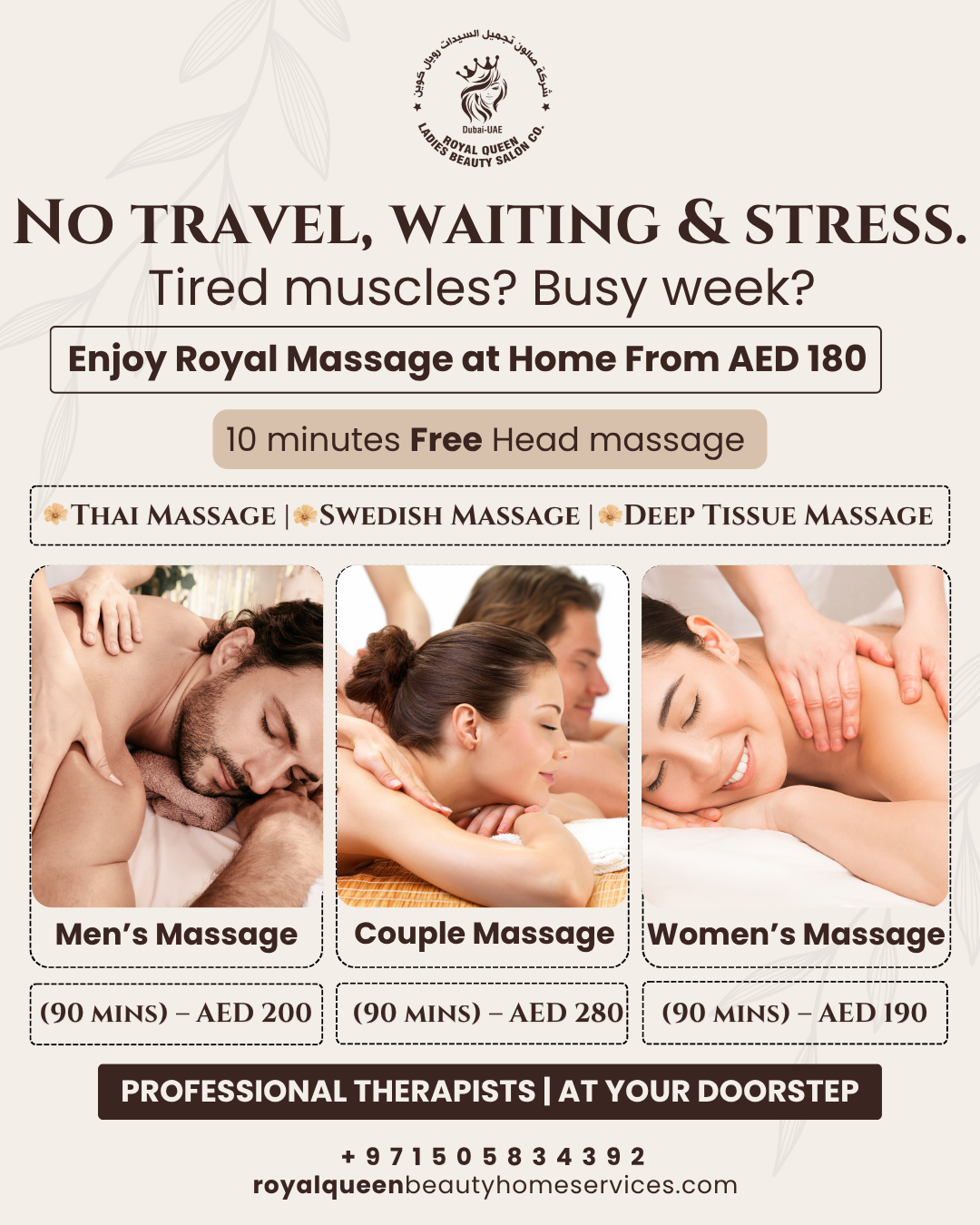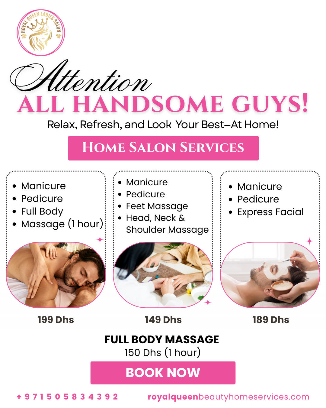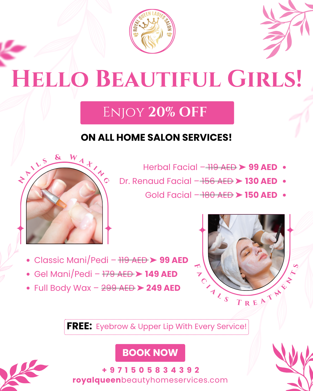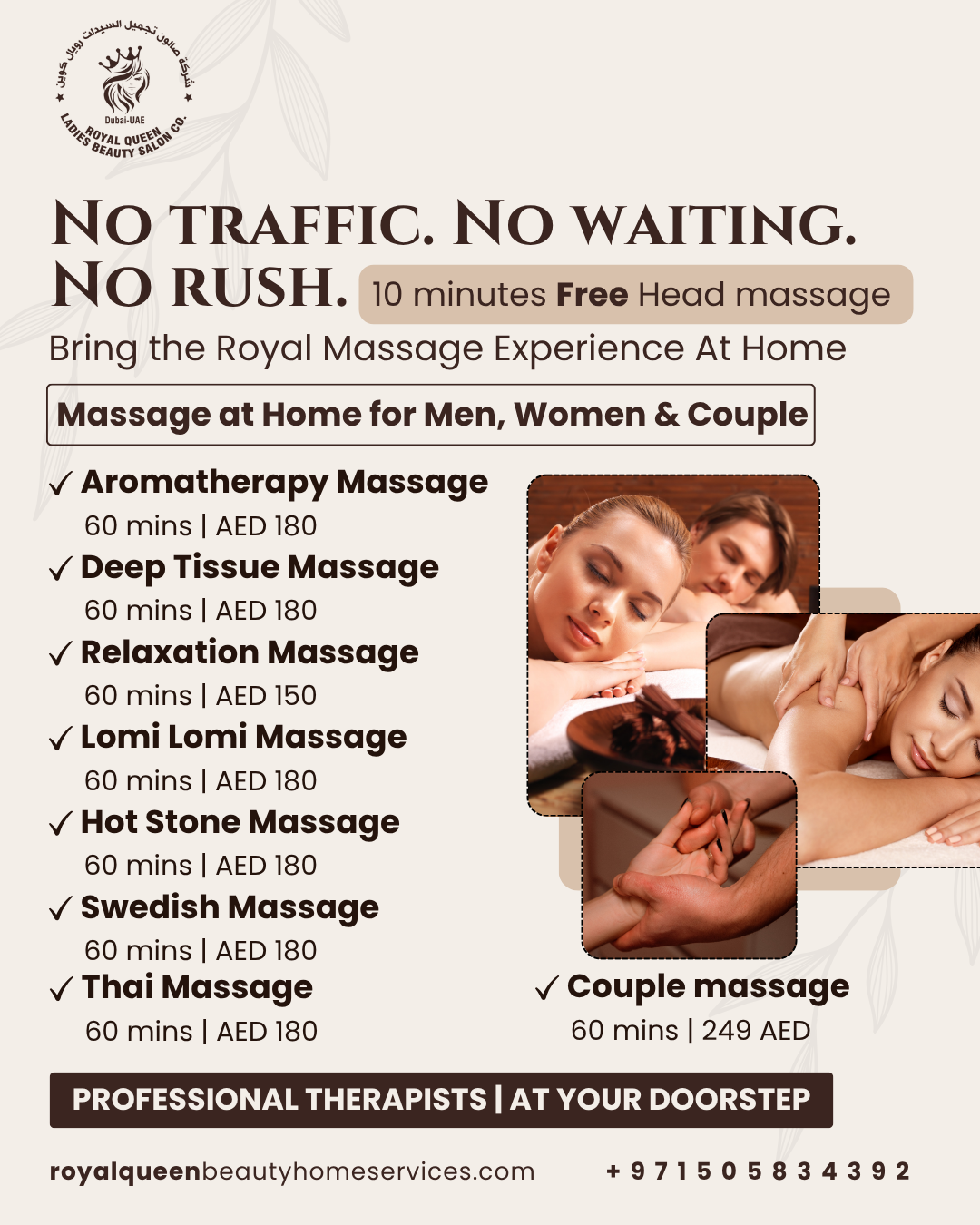 Royal Beauty Home Salon Services brings the salon to your doorstep, offering professional beauty treatments and body massage in the comfort of your home. Say goodbye to the hassle of traffic and waiting rooms, let us bring luxury and convenience to you.